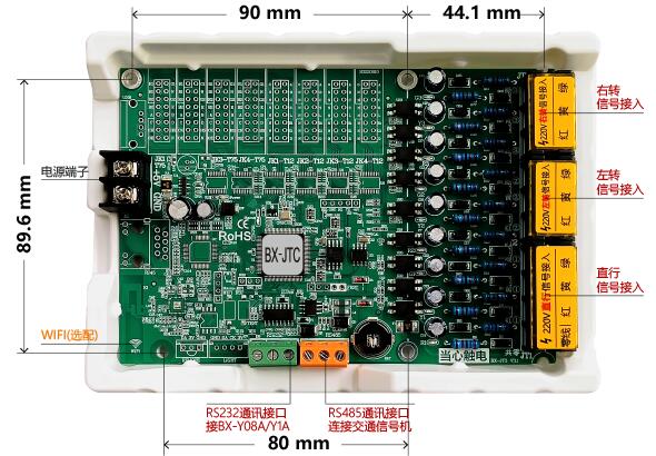 板載1路RS485串口和1路RS232串口,RS485接交通信號機,RS232接BX-Y08A/Y1A